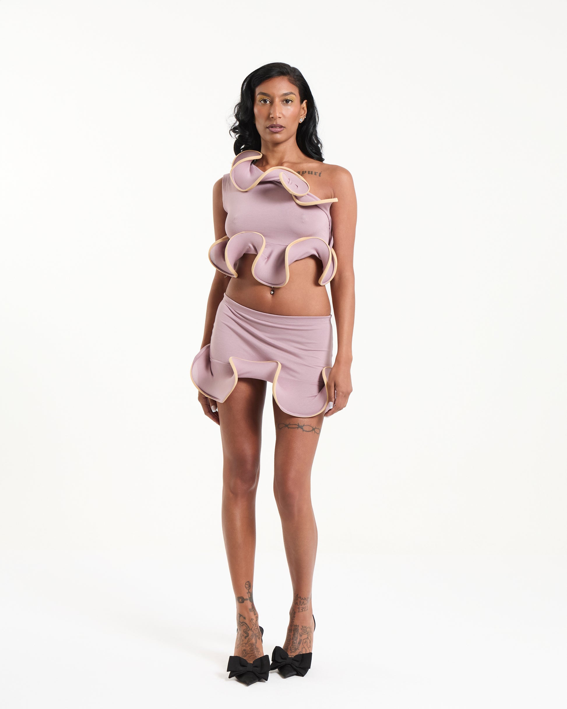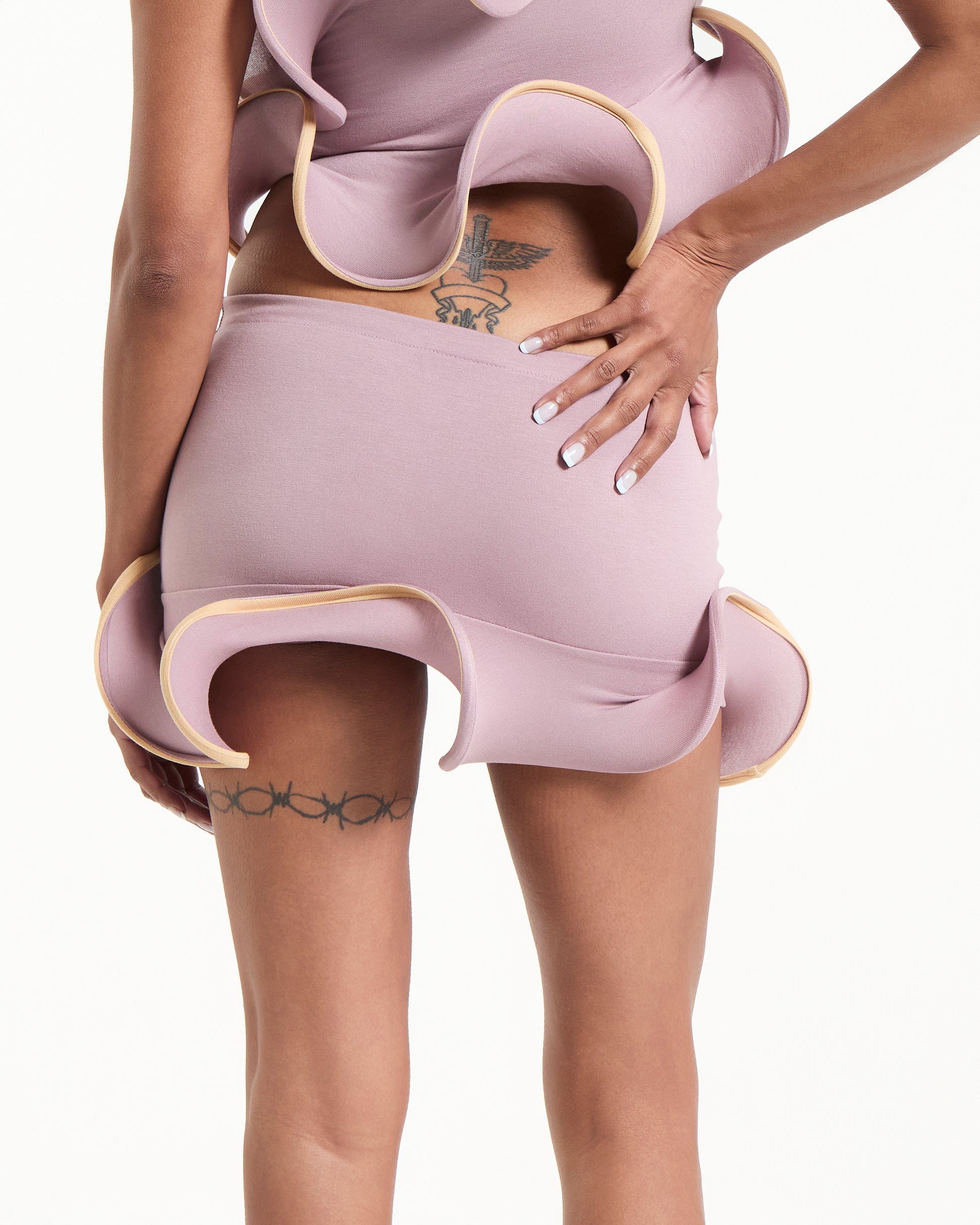 The lily mini skirt is a sculptural mini skirt made out of dusty pink colored viscose jersey with a golden-yellow detail.