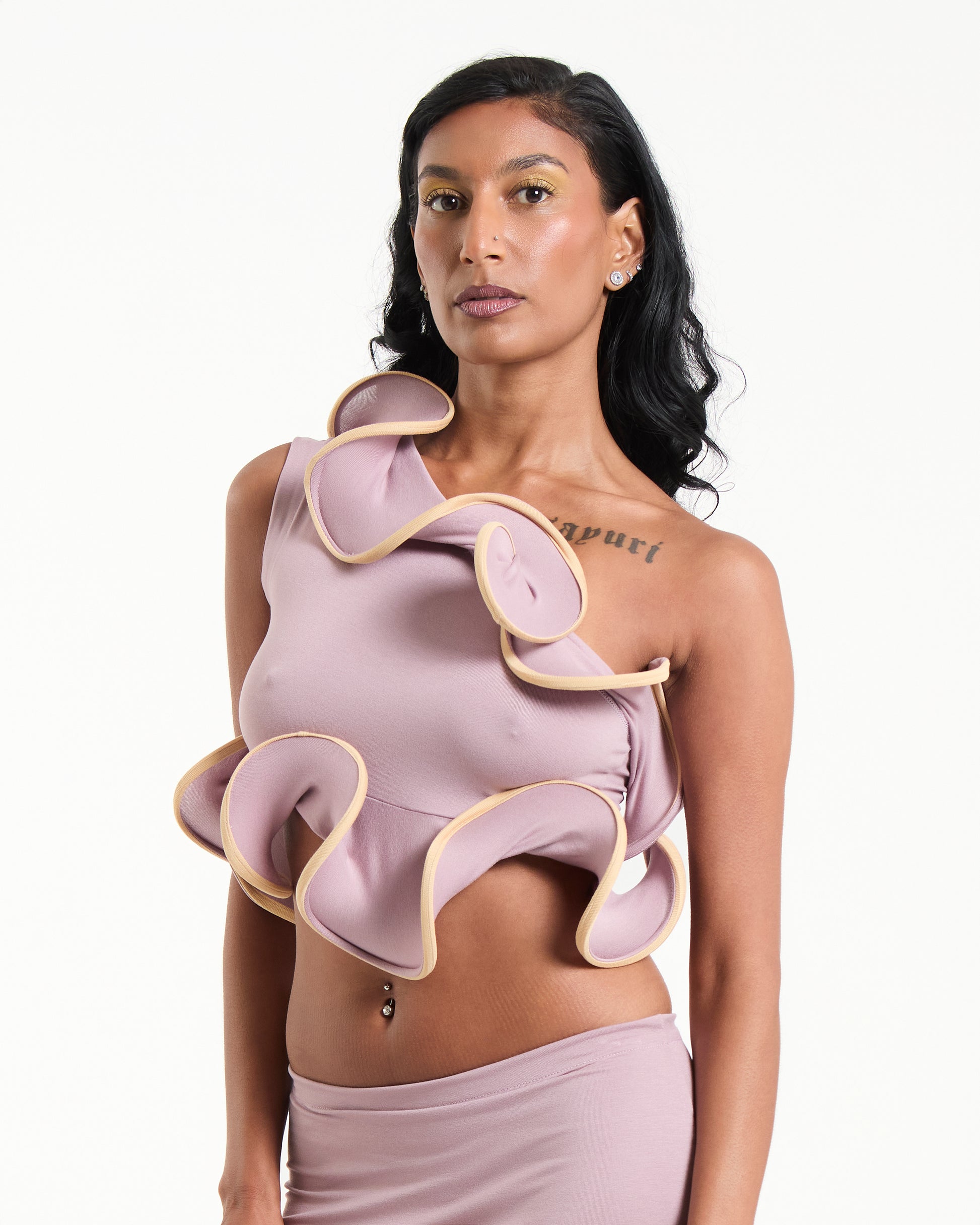 Featuring the brands signature volumetric forms, the top has petal like details at the top and hem.