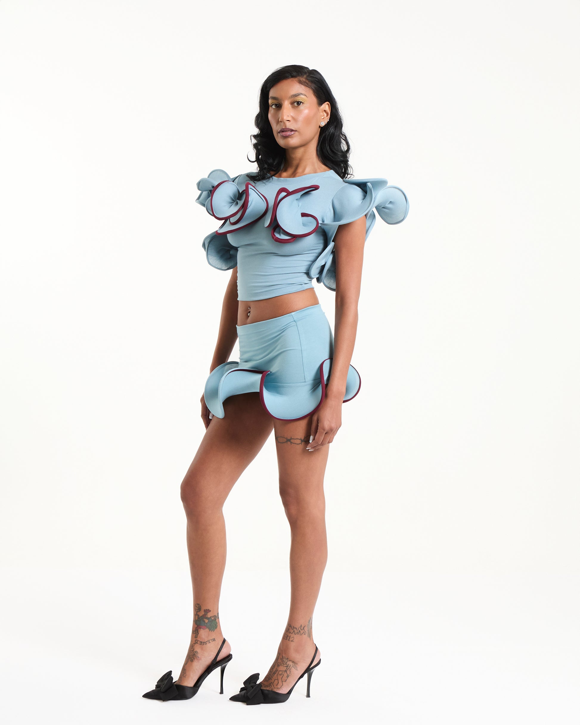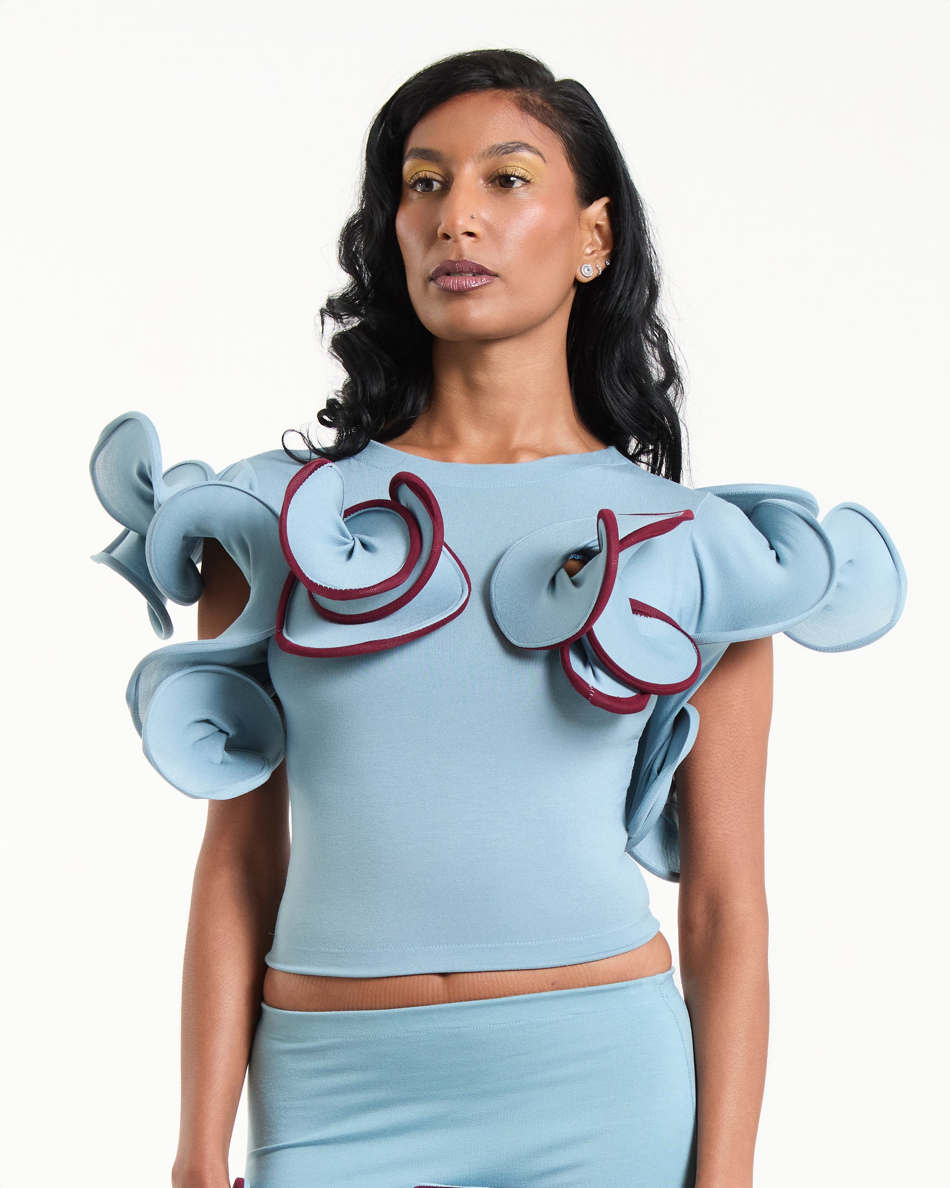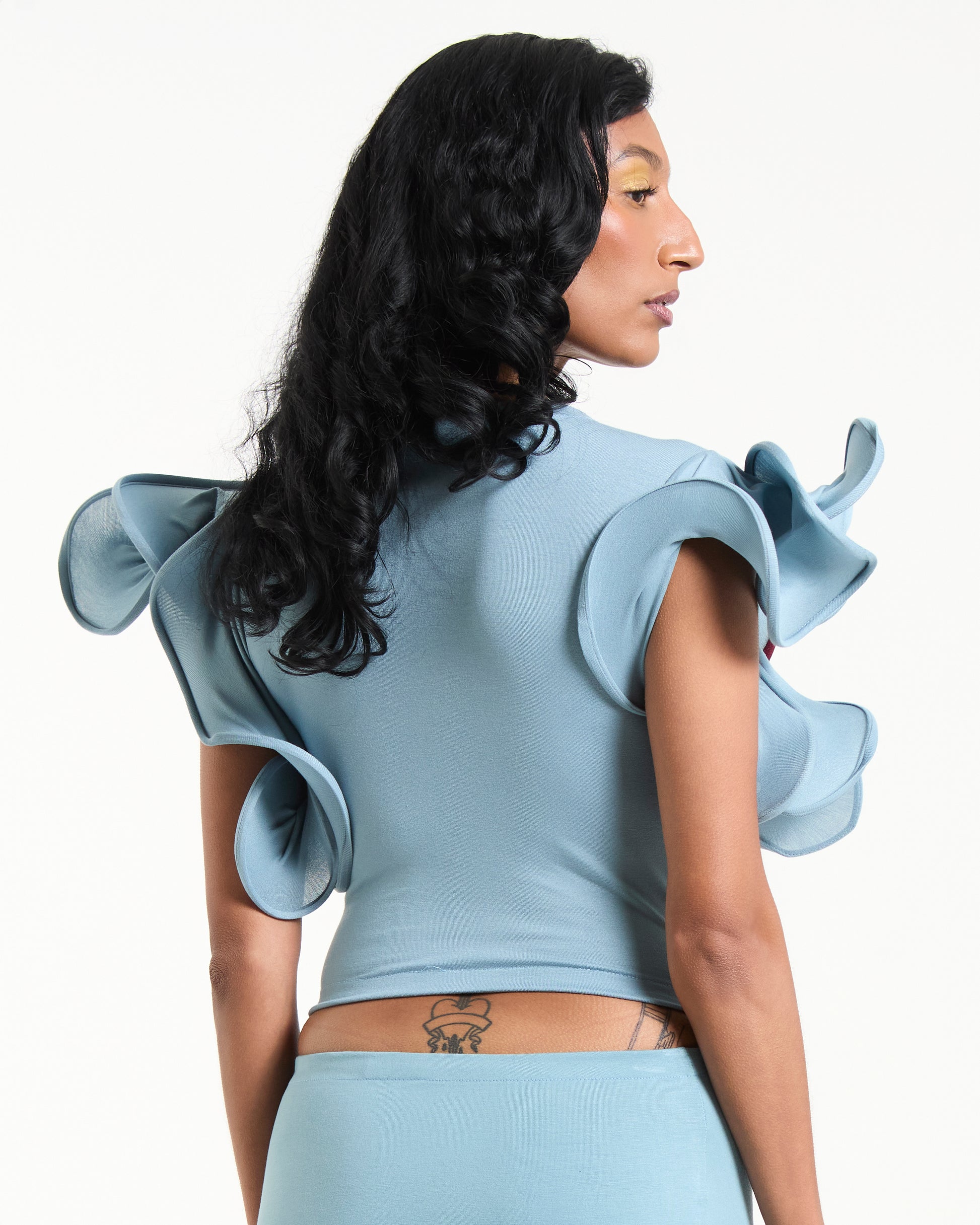 The blooming t is a sculptural baby tee in aqua colored viscose jersey.