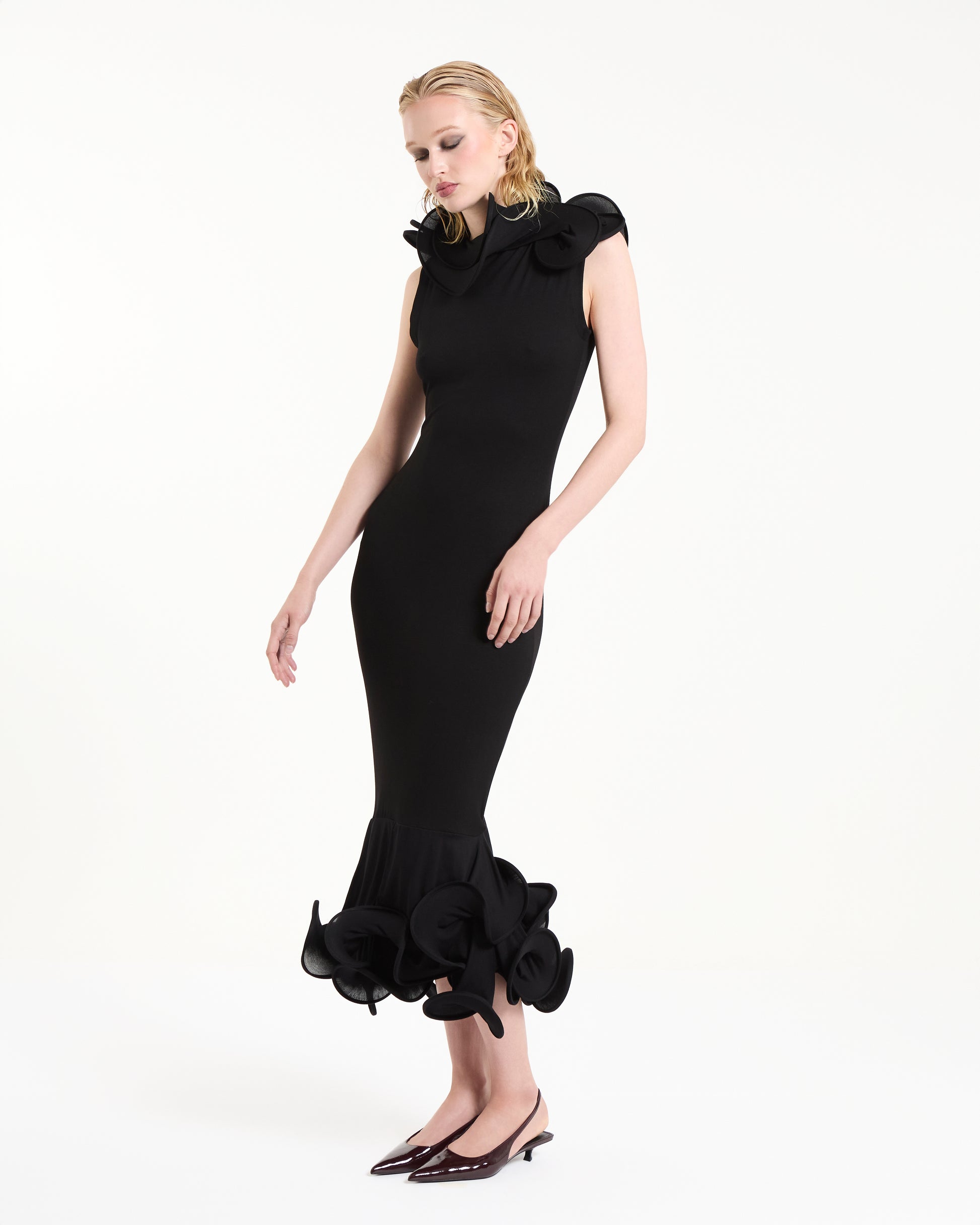 The morticia dress is a sculptural dress made out of black viscose jersey. Featuring the brand’s signature volumetric forms, it has double petal-like detailing at the hem and neckline.