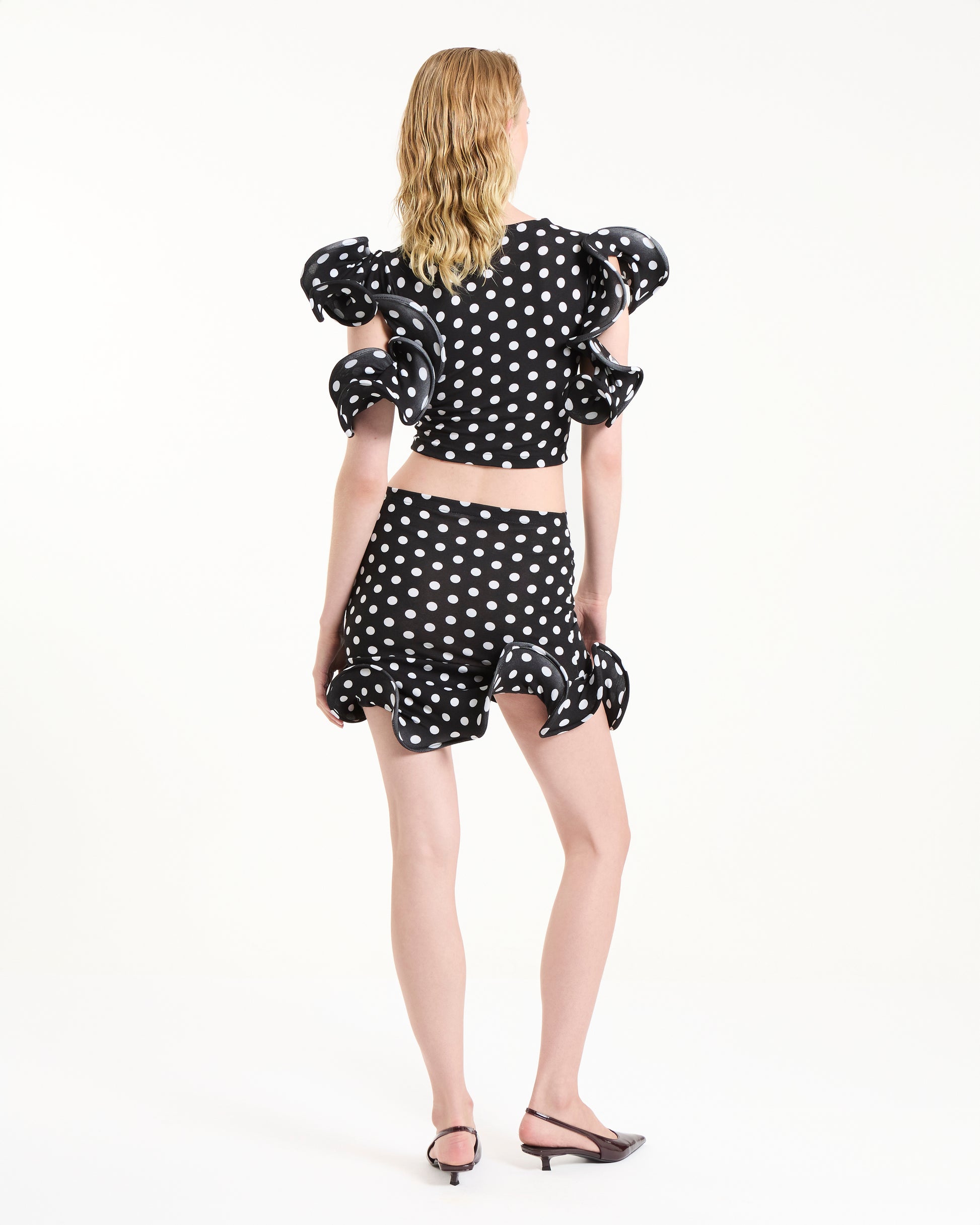 The polka t is a sculptural baby tee in viscose jersey with a polka dot pattern.